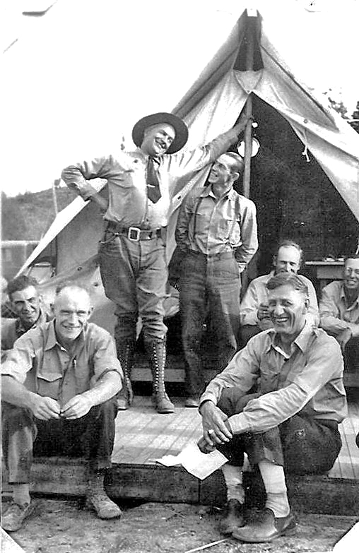 Big Creek CCC tent crew: Leo Black, foreman, in front of tent pole, looking up at Tiny Paige; Pete Hirst, another foreman, in back sitting, on far right edge of photo. Others are unidentified.