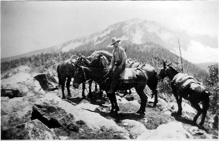 Barney Stone and pack mules are shown in this photograph high up in the Selkirks.