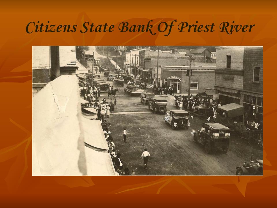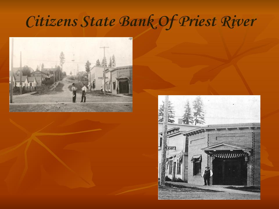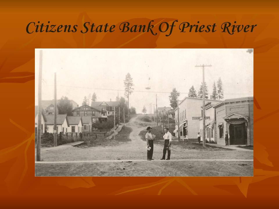 The bank was started with capital stock of $10,000 financed by businessmen from Newport, Washington.  Most of them had interest in the First National Bank in Newport.  Mr. Lee Berry, a Newport Businessman, was the first cashier.  Mr. Berry, who moved his family to Priest River, later had several run-ins with some of the Priest River’s outspoken locals.  Prior to the bank opening, people that wanted to bank had to travel to Newport or Sandpoint.  The bank’s first known President in May of 1910 was P.A. Smith.